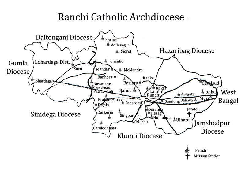 The present Archdiocese of Ranchi comprises the civil district of Lohardaga and a part of Ranchi covering 5, 299 sq. km. The total population in this area is above 18 lakh, of which 1, 0 4000 are Catholics. 87 Diocesan priests rendering their service in 33 parishes, 6 Mission Stations, and Schools. Belgian missionaries have done their part in evangelization. Now it is our turn to make alive the mission statement i.e., “Let the Fire Burn”.